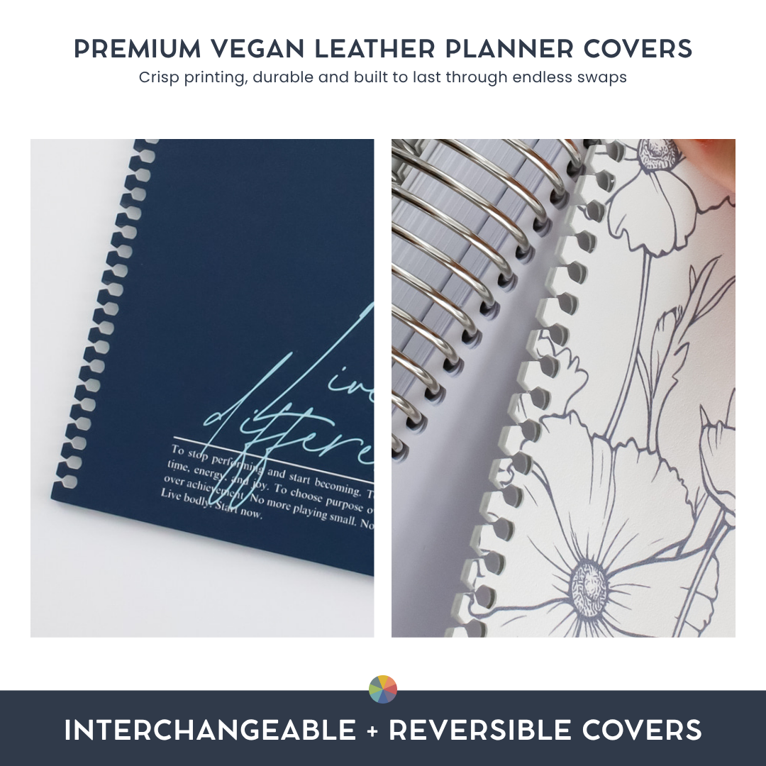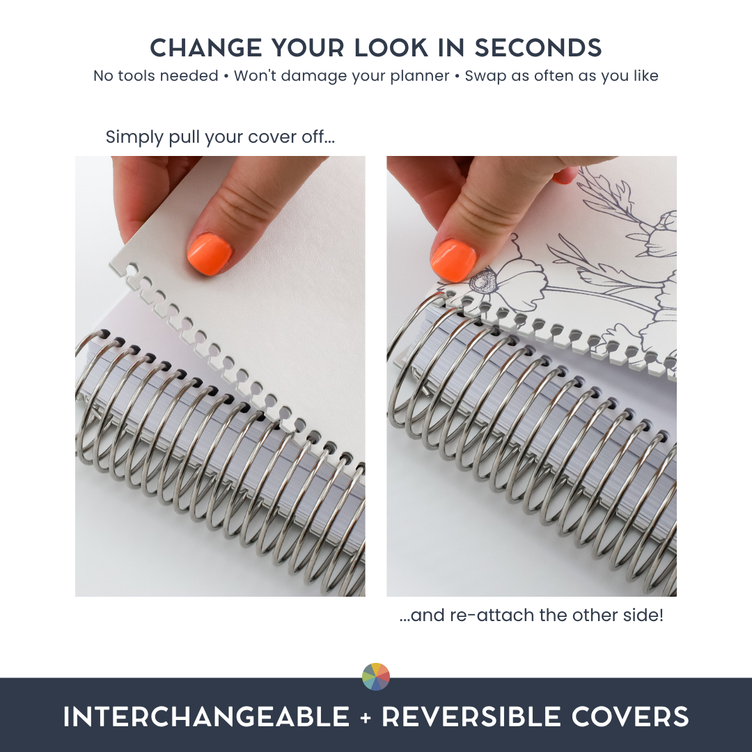 PLEASE NOTE: MäksēLife Interchangeable + Reversible Covers work with MäksēLife Goal-Setting + Weekly Planners, Undated Monthly Planners, Spiral Notebooks and other 7x9 planners with 36 coil loops.