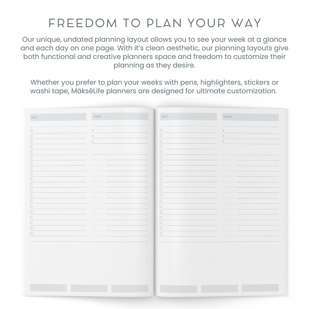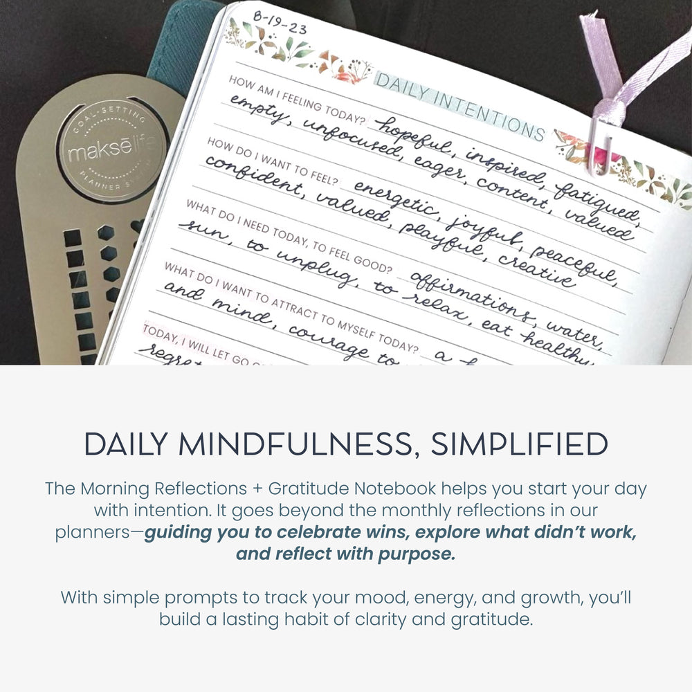 Reflecting on your actions, thoughts, and feelings is one of the most powerful tools in the MäksēLife system, so we created a daily reflection notebook that goes beyond the monthly reflections you’ll find in our flagship planners. Each day you’ll celebrate your wins, then explore what didn’t work and why. With our intention journal, you’ll stay focused on your “why” to live each day more purposefully and intentionally. And our gratitude journal guides you in a daily gratitude practice, something that can dramatically improve well-being, self-esteem, resilience, and joy. Each includes written prompts to help you identify growth opportunities, process emotions, and create more harmony in your life from an empowered, self-aware place.