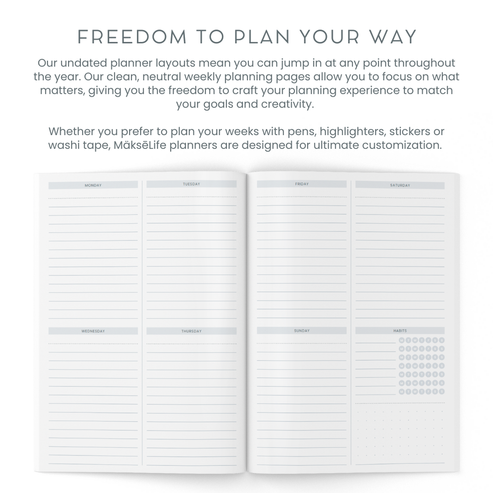At MäksēLife, we’re here to support your journey, your way. Our A5 journals, notebooks, and folios help you build a fully customized system based on what you want to focus on, and what works best for you. In addition to dot-grid notebooks for jotting down sudden bursts of inspiration and goal-setting companion notebooks that work with existing planners, we also have reflection journals and other tools for deeper exploration.