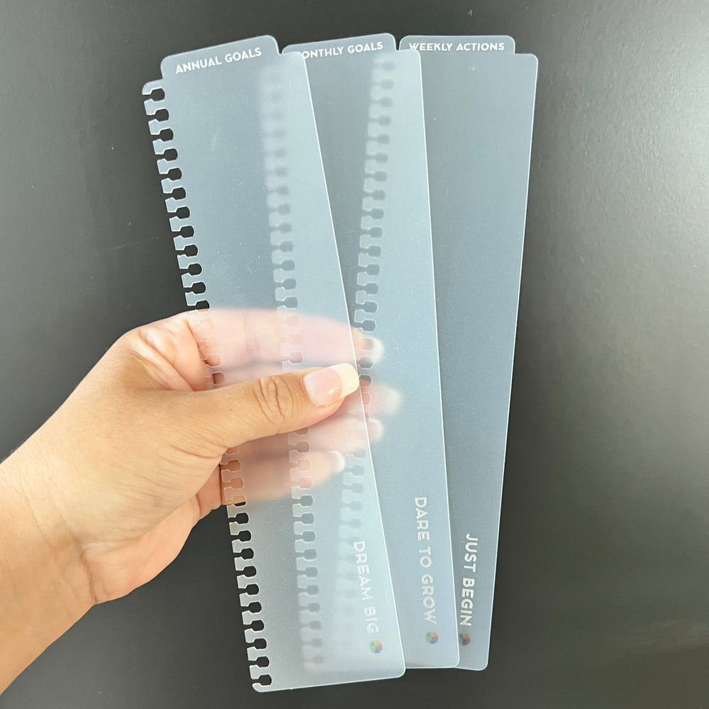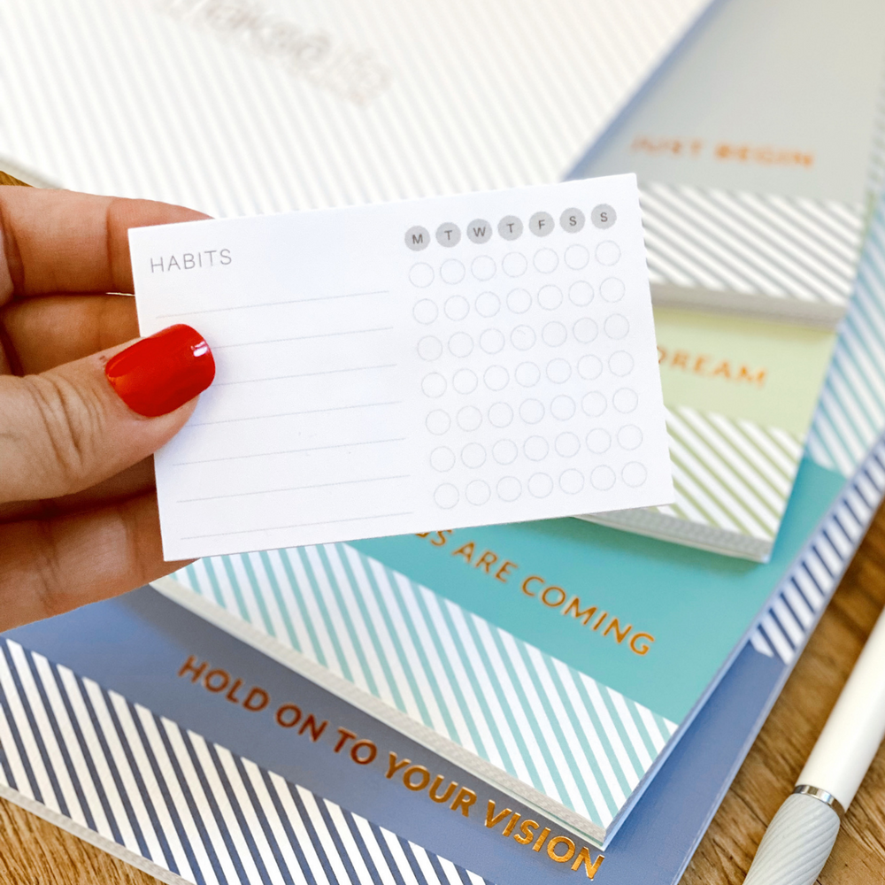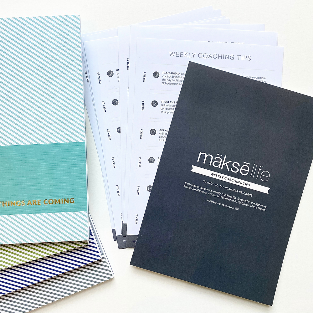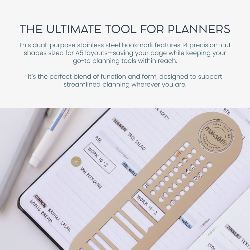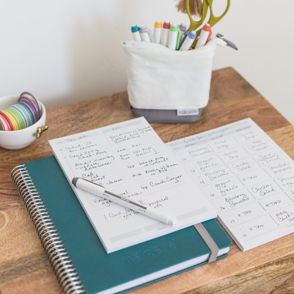 Personalize your MāksëLife system with our goal-setting planner accessories. Each is custom-designed to work with our printed planners—in both style and function. Flip straight to your vision, monthly goals, and weekly actions with our goal-setting bookmark trio so your “why” is never out of sight. You can also turn part of your weekly spread into a todo list with our checklist washi tape, perfect for shopping lists and errands. Printed on high-quality Japanese paper with eco-friendly ink, our washi tape has a matte finish so you can mark those satisfying checks with a ballpoint pen. And when life gets extra busy, pull a sheet from our daily sticky pad to insert a full daily planning page anywhere you need it.